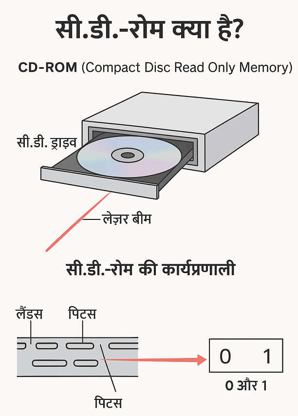सी.डी.-रोम डिस्क को सी.डी. ड्राइव में लगाया जाता है। ड्राइव में एक लेज़र बीम होती है, जो डिस्क पर बनी पिट्स (Pits) और लैंड्स (Lands) को पढ़ती है।